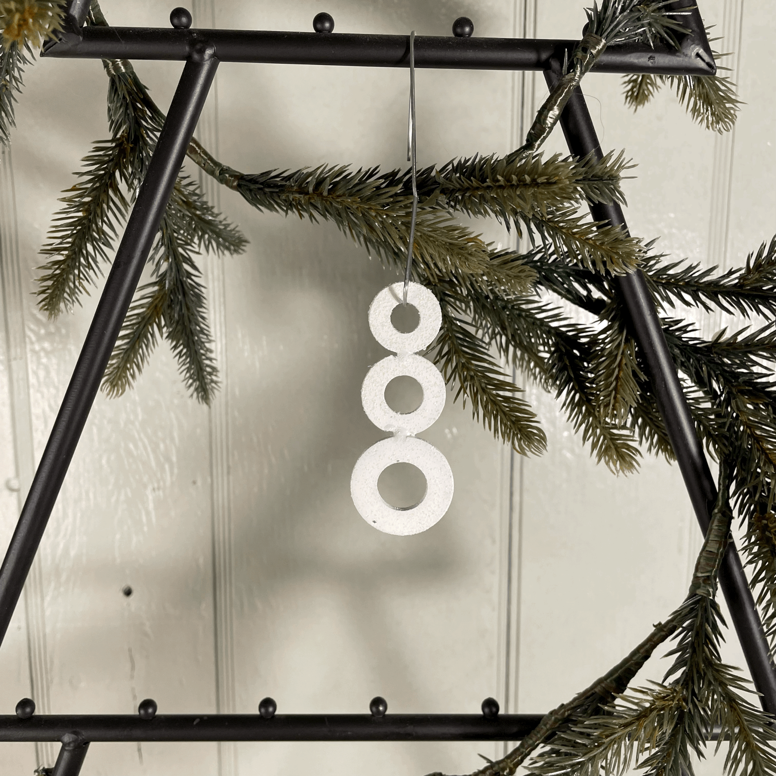 I present you a metal snowman that was welded together. Painted white and sprinkled with clear and glow in the dark glitter (to look like snow). This snowman is able to hang on a Christmas tree branch, wreath or any holiday decoration. This is an awesome unique ornament your family will love.